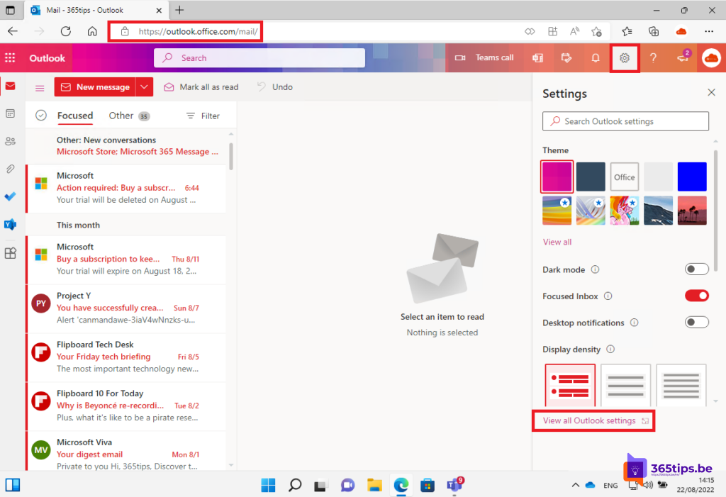 Kies vervolgens het tandwiel rechtsbovenaan en selecteer: Alle Outlook instellingen weergeven.